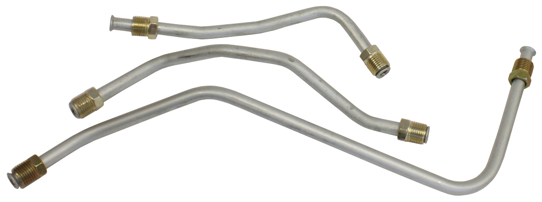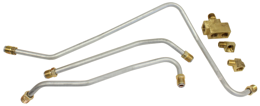 1959-1960 TRI POWER FUEL LINES, STEEL WITH 4 WAY FUEL BLOCK, FRONT AND REAR 105 DEGREE FITTINGS AND 90 DEGREE CENTER FITTINGS, SET (RE)