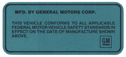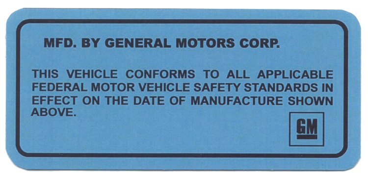 *FOR CORRECT COLOR DECAL SEE F116P* THIS DECAL IS LIGHTER BLUE THAN ORIGINAL. GM COMPLIANCE DECAL LOCATED ON THE END OF THE DRIVERSIDE DOOR JUST BELOW THE LATCH. VIN NUMBER WILL NEED TO BE TYPED IN. COMES WITH INSTRUCTION. It is unlawful to type information on this decal that does not accurately and directly apply to the vehicle it is being used on. This comes w/ clear adhesive cover.