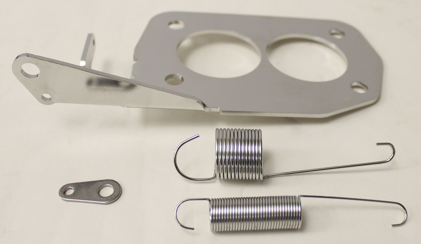 THIS IS A LOKAR STAINLESS STEEL THROTTLE CABLE BRACKET FOR LOKAR THROTTLE CABLES. MOUNTS BETWEEN REAR CARB AND MANIFOLD. TWO N209F GASKETS REQUIRED. TWO STAINLESS RETURN SPRINGS INCLUDED. FOR CABLES SEE N148,N148A